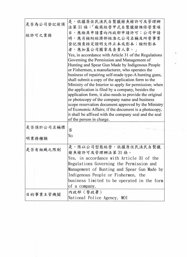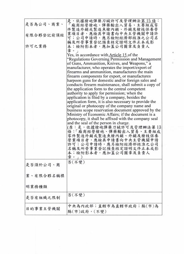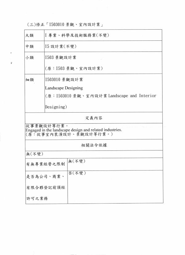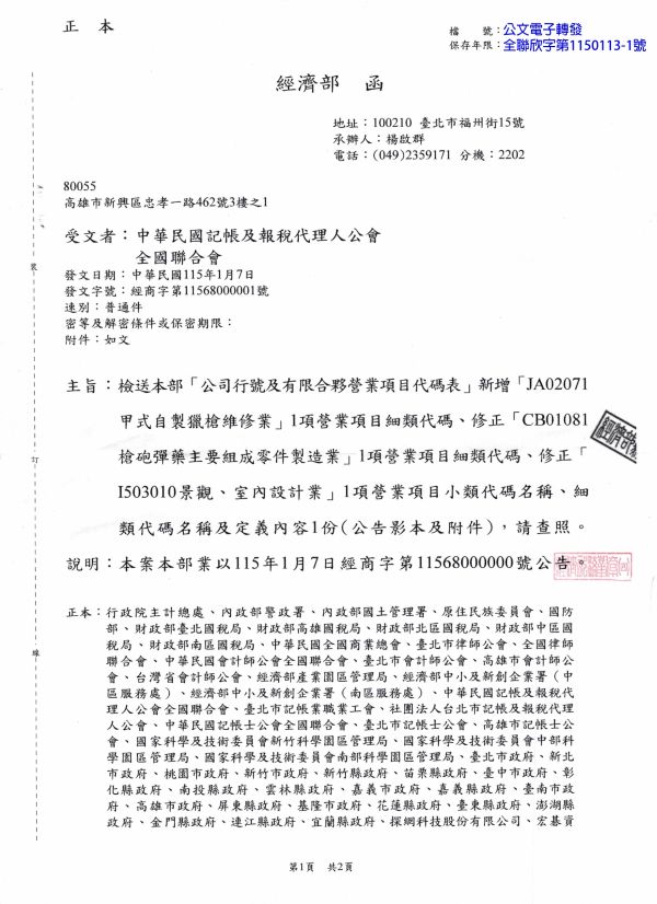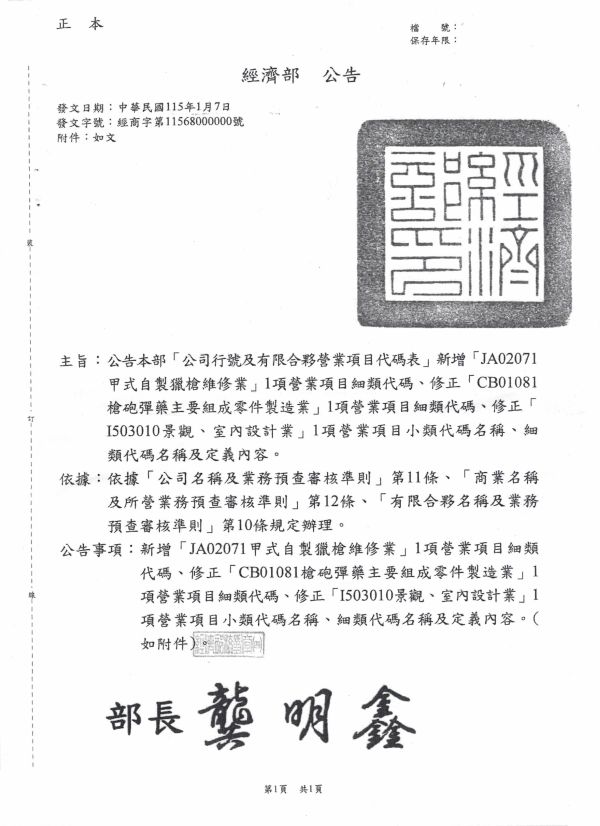 主旨:檢送經濟部「公司行號及有限合夥營業項目代表」新增「JA02071甲式自製擸槍維修業」1項營業項目細類代碼、修正「CB01081槍砲彈藥主要組成零件製造業」1項營業項目細類代碼、修正「1503010景觀、室內設計業」1項營業項目小類代碼名稱、細類代碼名及定義內容1份(公告影本及附件)。