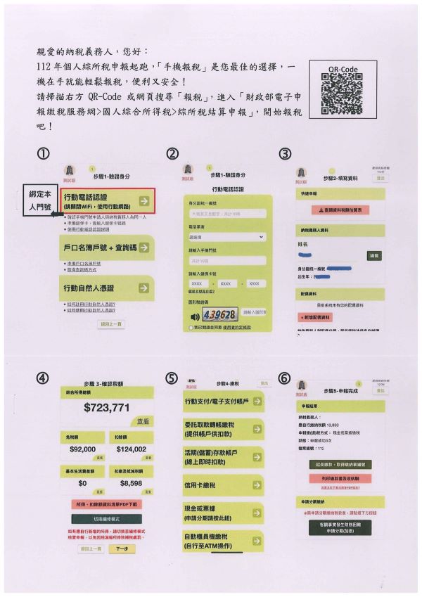 三、如不同意試算內容或不適用稅額試算服務,為便利納稅義人申報,使用納稅義務人本人申租之行動電話搭配健保卡卡號,採行動電話認證方式登入手機版系統,即可完成申報,免插卡免用憑證,檢送操作文宣1份,如有操作問題可參考文宣內容或洽詢承辦人。