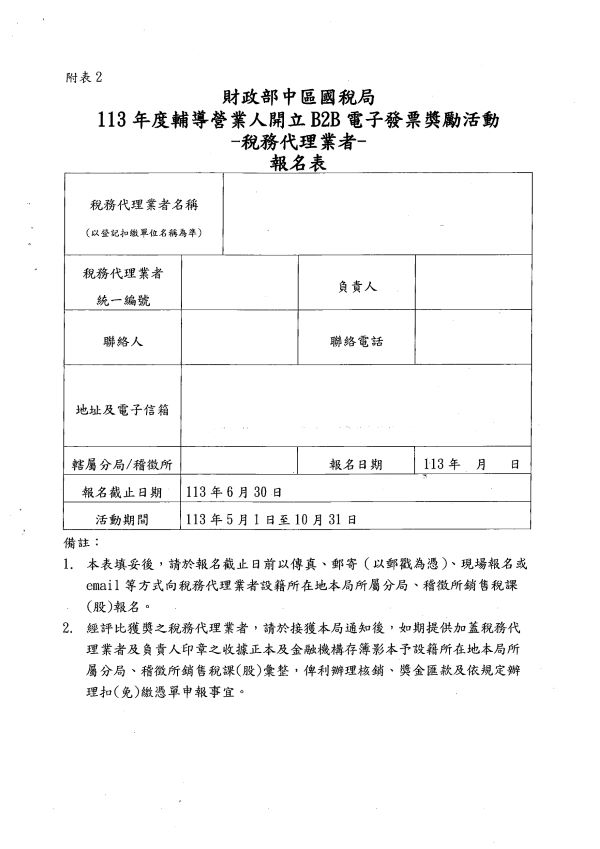 主旨:檢送中區國稅局「113年度輔導營業人開立B2B電子發票獎勵活動簡章」及報名表1份,請踴躍報名並輔導代理之營業人開立電子發票。