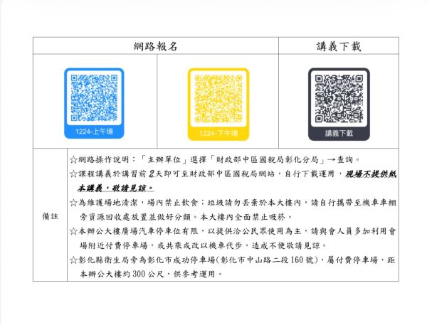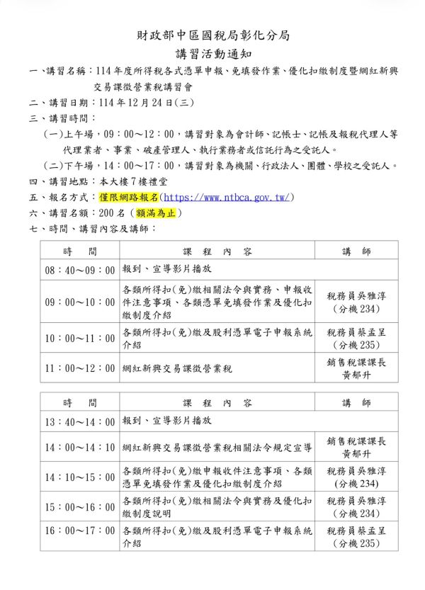 (彰化分局)12/24(三)舉辦「114年度所得稅各式憑單申報、免填發作業暨優化扣繳制度暨網紅新興交易課徵營業稅講習會 」代轉彰化分局講習通知