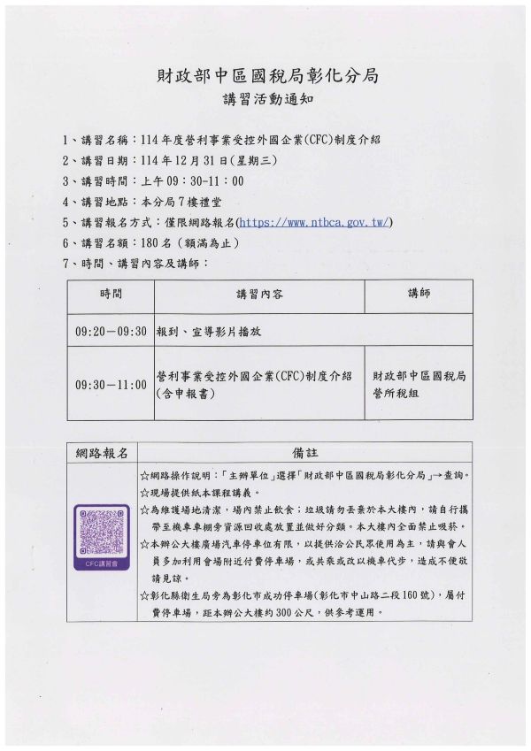 主旨:謹訂於114年12月31日(星期三)上午9時30分至11時在彰化分局7樓禮堂舉辦「114年度營利事業受控外國企業(CFC)制度介紹」稅務專題講習會,請踴躍報名參加。