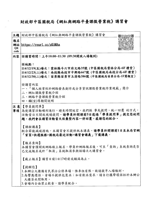 主旨:檢送中區國稅局114年12月份增加雲林縣、南投縣及苗栗縣辦理「網紅與網路平臺課徵營業稅」講習會活動場次資料,請踴躍參加。